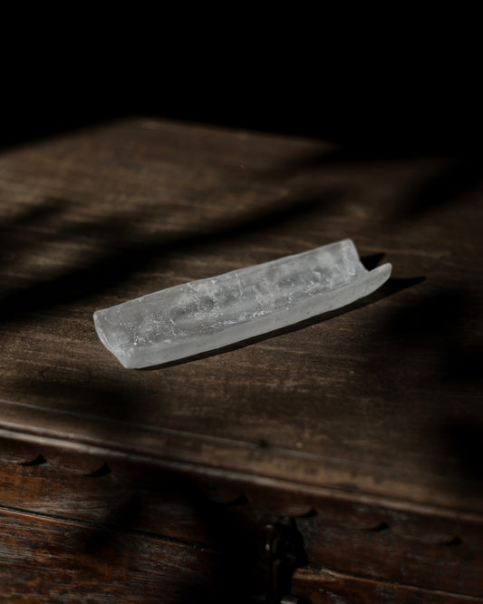 經過多年打磨研習,源自 3500 年前兩河流域文化的「琉璃脫蠟鑄造法」(Pâte de verre) 在作者日漸嫻熟的創作進程中,逐漸成為一門專屬於她的文字體系,而冰體與玻璃的恰巧形似,也像極了互為韻腳的詩文,體裁不拘但一致抒情。虎口輕握沁涼杯身,桌沿這一側,想起的是某一年遠行到知床的白色流冰;對面一方的鏡頭框內,則是擱淺在冰島黑沙灘上的巨大冰磚,鎮守在中央如紫晶色澤的托盤,盛裝著共享的當下。