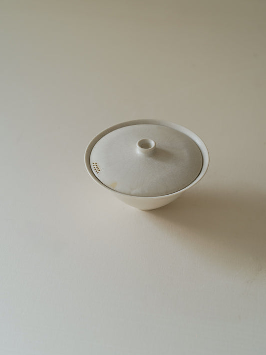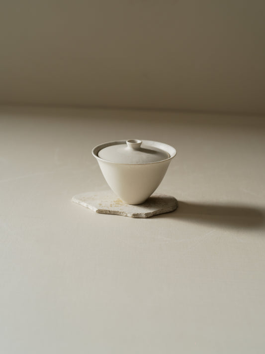 向宋代汝窯謳歌的「開片」紋理,作為系列作品的標識之一,她手下自然流瀉的女性氣韻,綻放在席前一把把秀氣溫雅的側把急須,那是江戶時代便已現蹤的古典。成群結隊緊跟在側的是身長不一、攀著虎口流線刻劃成型的盞盞茶海,它們裹著 tone on tone 的牛骨色灰釉,在芒種與入梅間出窯,換個國度繼續過夏。