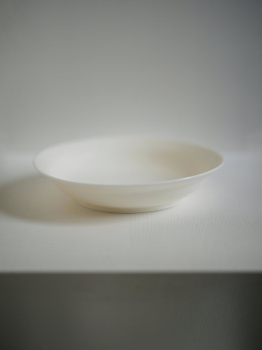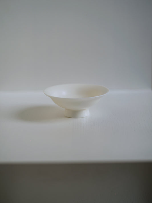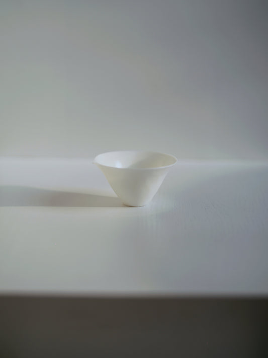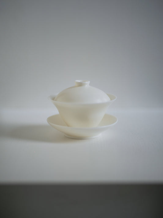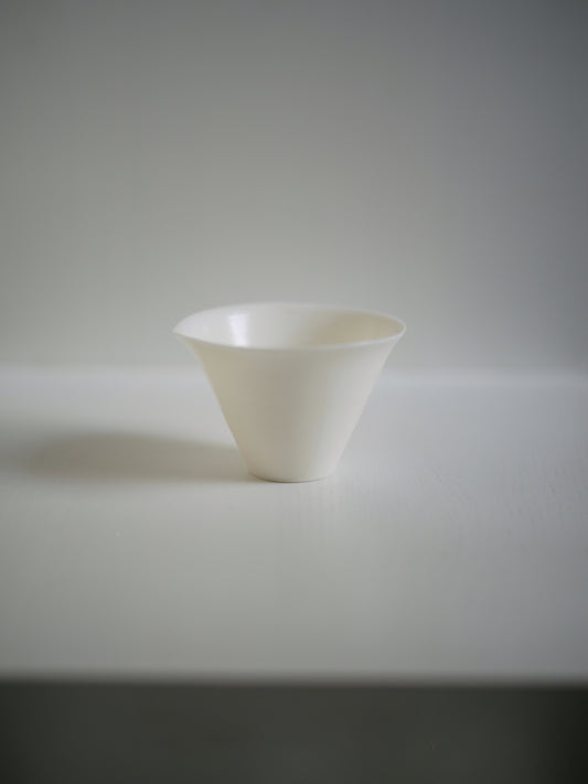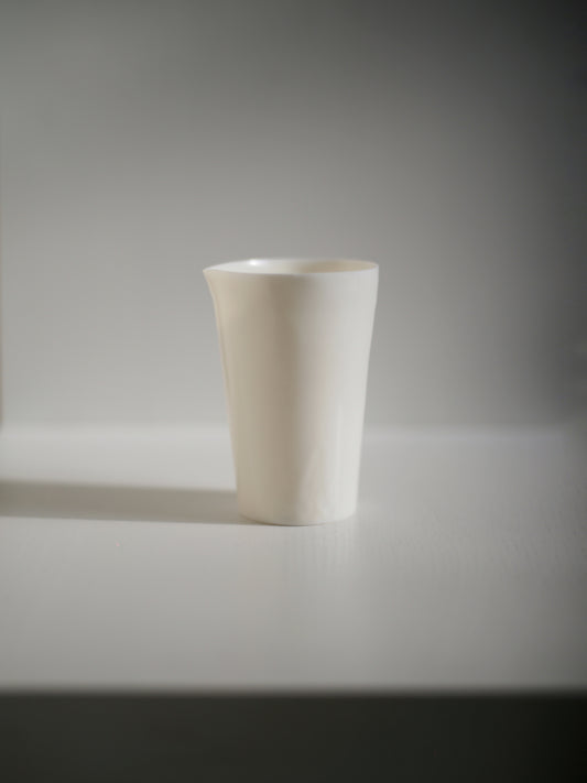 挑選目數大的泥料為的就是坦露,氣孔如取樣器網羅採集:溜進左耳的是造訪東京 SKWAT 後的悠揚弦樂,就算右耳還哼著前個夏天成日作伴的 City Pop 復古合成器音,做陶這件事接近自我修繕,本身就是施與捨的體現。如樂譜、如繃實的畫布,德化白瓷的亮滑被壓製成輕薄的片片空白,只為映襯茶湯的金橙色;朱泥飽滿的養育力在肌肉記憶的帶動之下,無論鳴針或面取,成色略異的細膩才是收放得宜的趣意。兩樣性格,何須互斥。