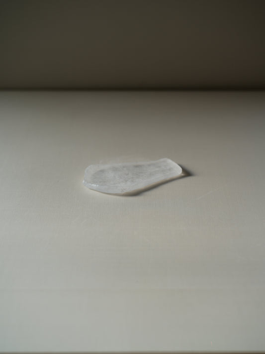 經過多年打磨研習,源自 3500 年前兩河流域文化的「琉璃脫蠟鑄造法」(Pâte de verre) 在作者日漸嫻熟的創作進程中,逐漸成為一門專屬於她的文字體系,而冰體與玻璃的恰巧形似,也像極了互為韻腳的詩文,體裁不拘但一致抒情。虎口輕握沁涼杯身,桌沿這一側,想起的是某一年遠行到知床的白色流冰;對面一方的鏡頭框內,則是擱淺在冰島黑沙灘上的巨大冰磚,鎮守在中央如紫晶色澤的托盤,盛裝著共享的當下。