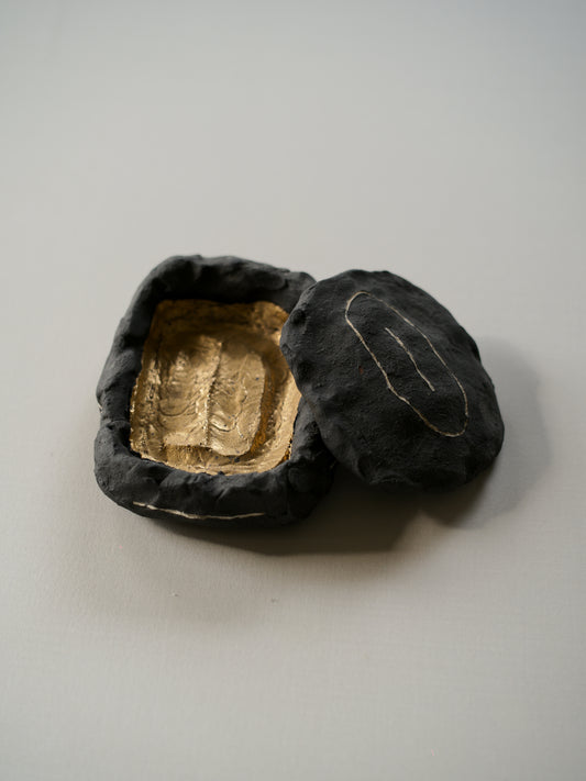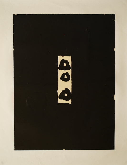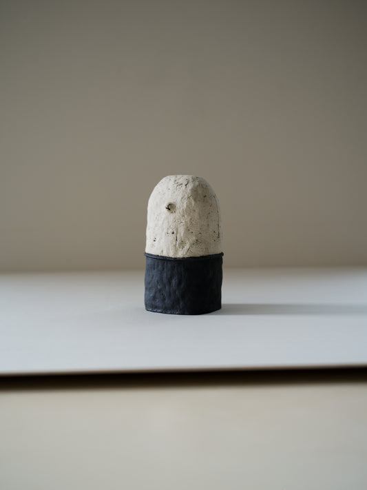 這一頭,挪用象徵生命起止的圓圈,將人生難免的別離傷感化為謳歌,如綿密的音符飛揚,緩緩著陸在手作和紙的骨白色平方。是聽不見的奏鳴曲;轉過身,扭曲縮擠成多重的圖騰印記,將夢想液化成沾了釉彩的筆刷,像勾邊的山岩剪影,緊緊環抱於圓潤流線的花器身軀上。是摸得著的回憶紀實。