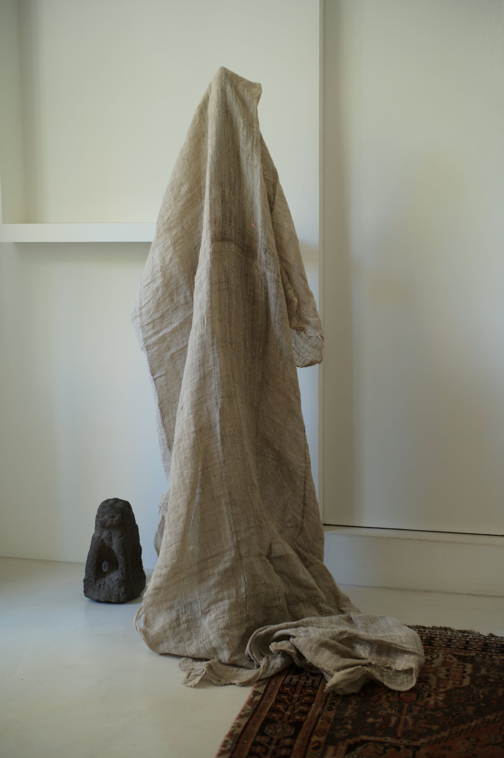 此布料由舊蚊帳拆解而成,推測出自昭和初期。材質包含麻與棉麻混織,部分因觸感與外觀難以精確區分。保存狀態良好,既有古物特有的氛圍,同時仍保有舒適可用的實際條件。尺寸靈活,可作為暖簾、遮蔽布、空間隔斷,或鋪布使用。